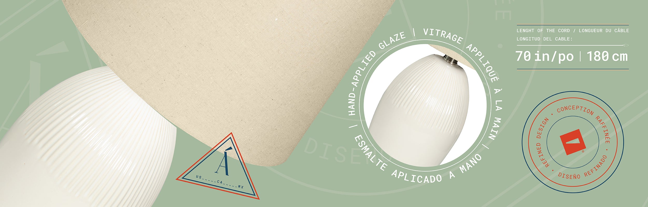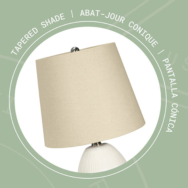 Desing: Modern ceramic table lamp featuring an elegant, ribbed vase-style base in pristine white with a classic oatmeal linen drum shade